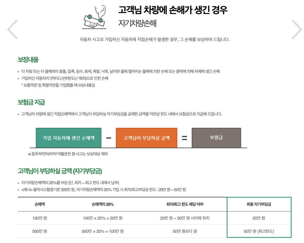 - 자동차 사고 보상: 차량 사고로 인한 손해를 보상받을 수 있습니다. 손해액에 따라 자동차 수리비 및 파손 보상을 제공합니다.