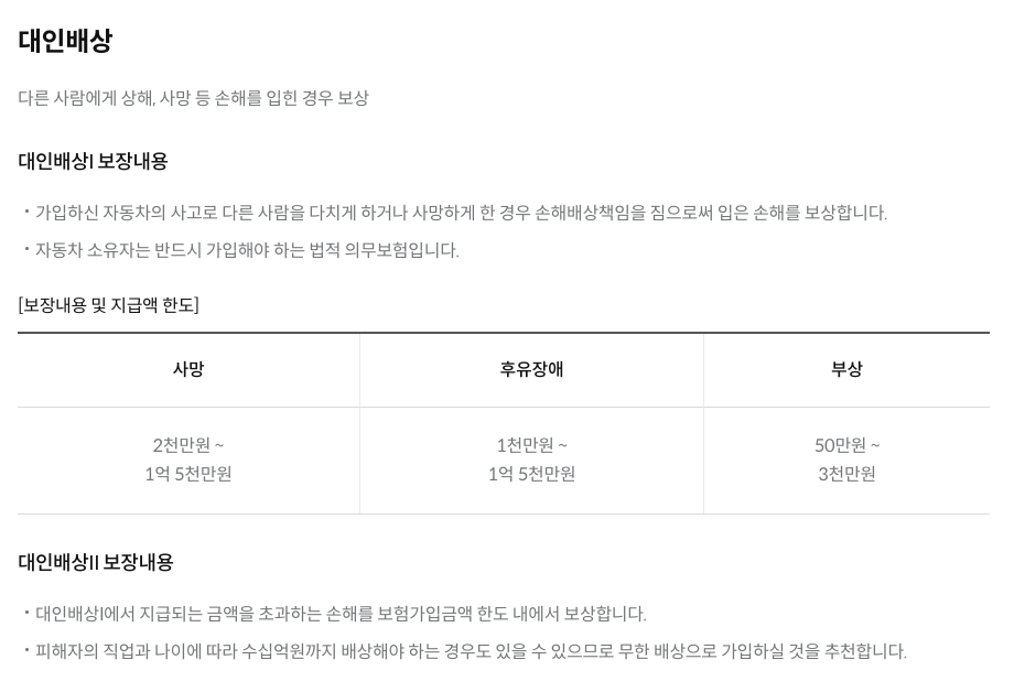 - 대인/대물사고 보상: 운전 중 다른 차량이나 재산에 대한 손해를 입힌 경우에 대한 보상을 제공합니다. 이에는 타인 차량의 수리비용 및 타인에 대한 치료비 등이 포함될 수 있습니다.