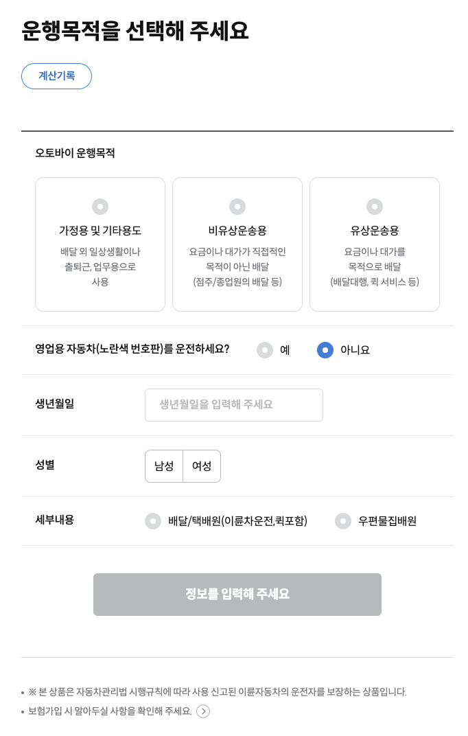 - 보험료 산정: 보험 가입을 위해 필요한 정보를 입력하고 보험료를 산정합니다. 이때 차량 정보, 운전 경력, 건강 상태 등에 관한 정보를 입력해야 합니다.