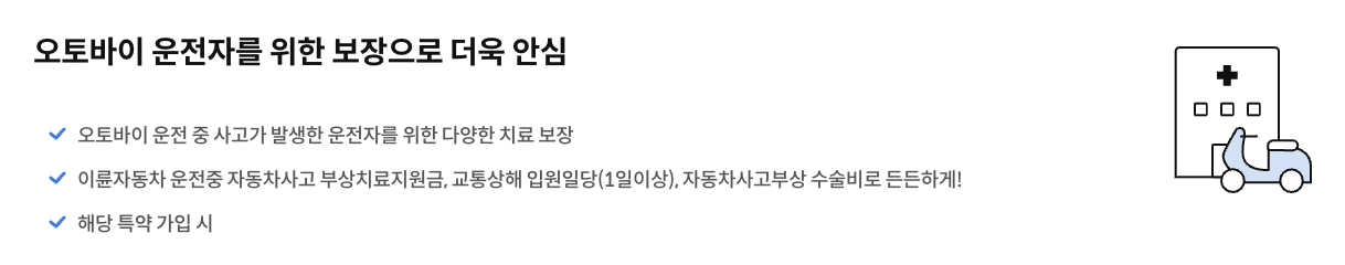 라이딩을 즐기는 모든 오토바이 라이더를 위한 안전하고 편안한 보호를 제공합니다. 운전 중 발생할 수 있는 다양한 사고와 손해에 대비하여 안전하고 안심한 라이딩을 즐길 수 있도록 도와드립니다. 저렴한 보험료와 다양한 혜택으로 여러분의 라이딩을 더욱 안전하게 보호하세요. 지금 바로 가입하세요!