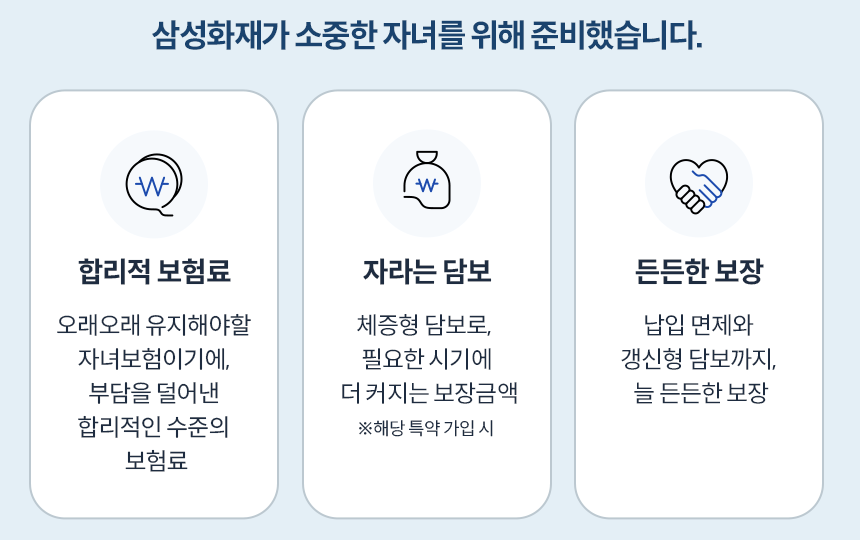 - 출생 후 보험 가입 용이성: 출생 후에도 자녀에게 보장을 제공하는 보험 상품입니다. 출생과 동시에 자녀에게 보험 가입이 가능하며, 출생 전에 가입한 보험의 연장 혜택을 받을 수 있습니다.