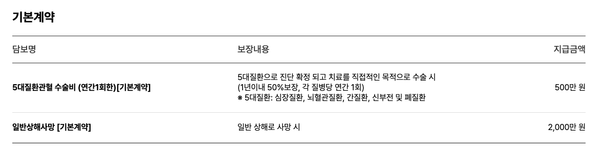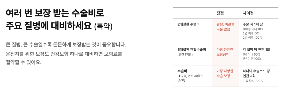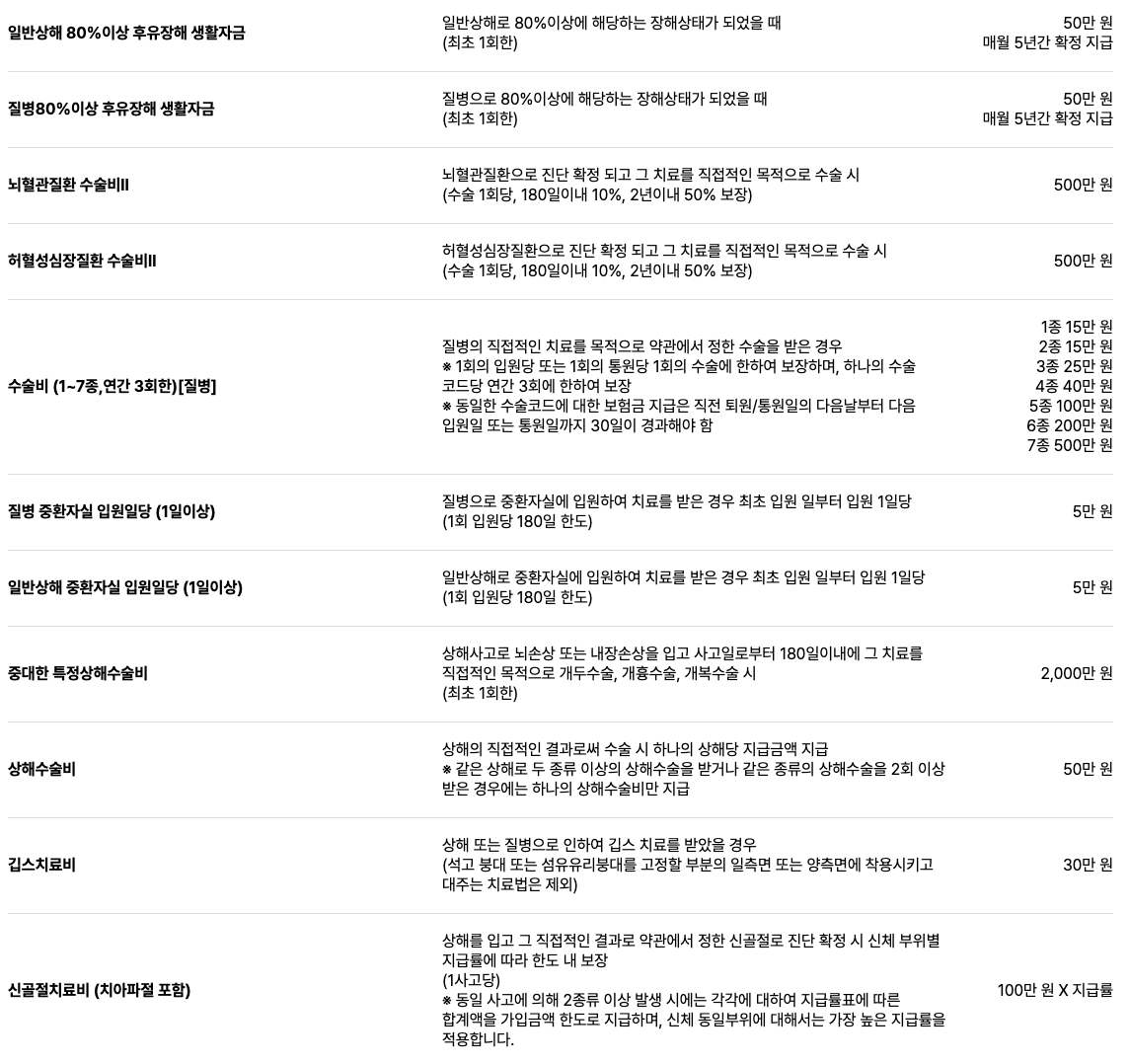 - 수술비 보장: 수술을 받은 경우 수술비용을 보장합니다. 수술비용, 마취비용, 병원 내 치료재료 비용 등이 보장됩니다.