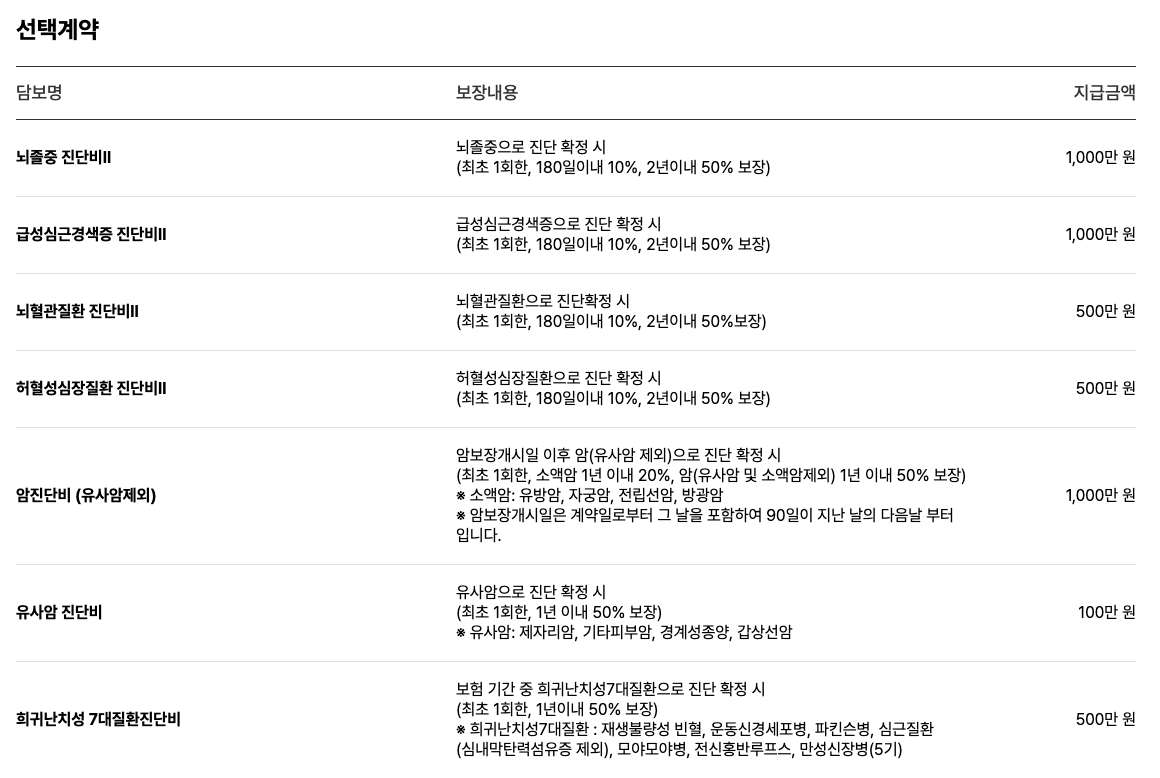 - 병원 진료비 보장: 의료진단을 받은 경우 진료비용을 보장합니다. 입원비, 퇴원 후 재진료, 약제비, 검사비 등이 보장됩니다.