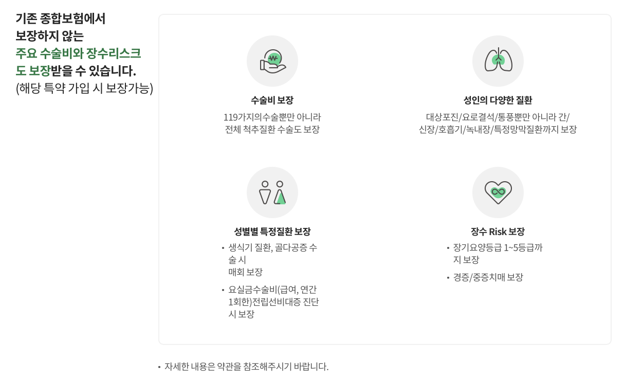 또한, 이 보험은 다양한 질병에 대한 수술비와 입원일당을 보장합니다. 이는 119대 질병 수술비와 일정 기간 동안의 질병 입원일당을 포함할 수 있으며, 응급실 내원비도 특정 조건 하에 보장받을 수 있습니다. 보장 내용과 금액은 선택한 특약과 보장 조건에 따라 달라지므로, 보험 계약을 체결하기 전에 반드시 상품 설명서와 약관을 확인해야 합니다.