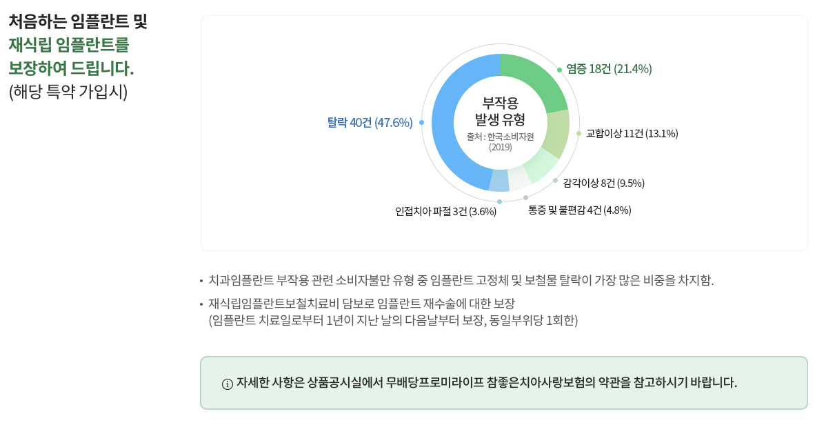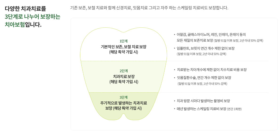 DB손해보험의 참좋은치아사람보험은 다양한 치과 치료에 대해 폭넓은 보장을 제공하는 것이 큰 장점입니다. 이 보험 상품은 치아 치료가 필요한 경우 경제적 부담을 크게 줄여주며, 일반적인 치료는 물론이고 보철, 임플란트, 브릿지, 크라운 치료 등에 대해서도 보장합니다. 특히, 보장 내용에는 충치 치료와 같은 기본적인 치과 치료뿐만 아니라, 보다 전문적이고 비용이 많이 드는 치과 치료도 포함되어 있어 많은 사람들에게 실질적인 혜택을 제공합니다.