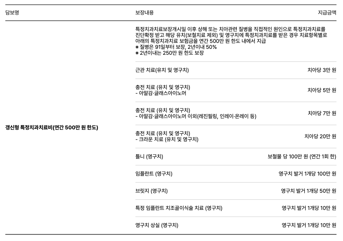 - 치아 관련 진료비: 최대 100% 보장 (연간 최대 500만원)