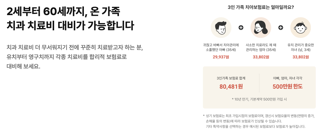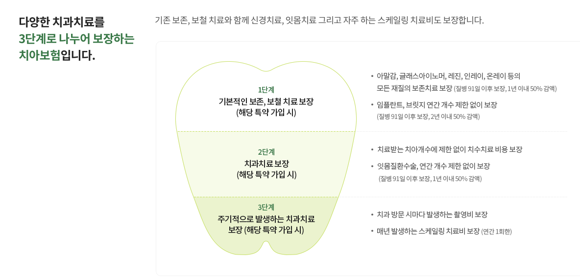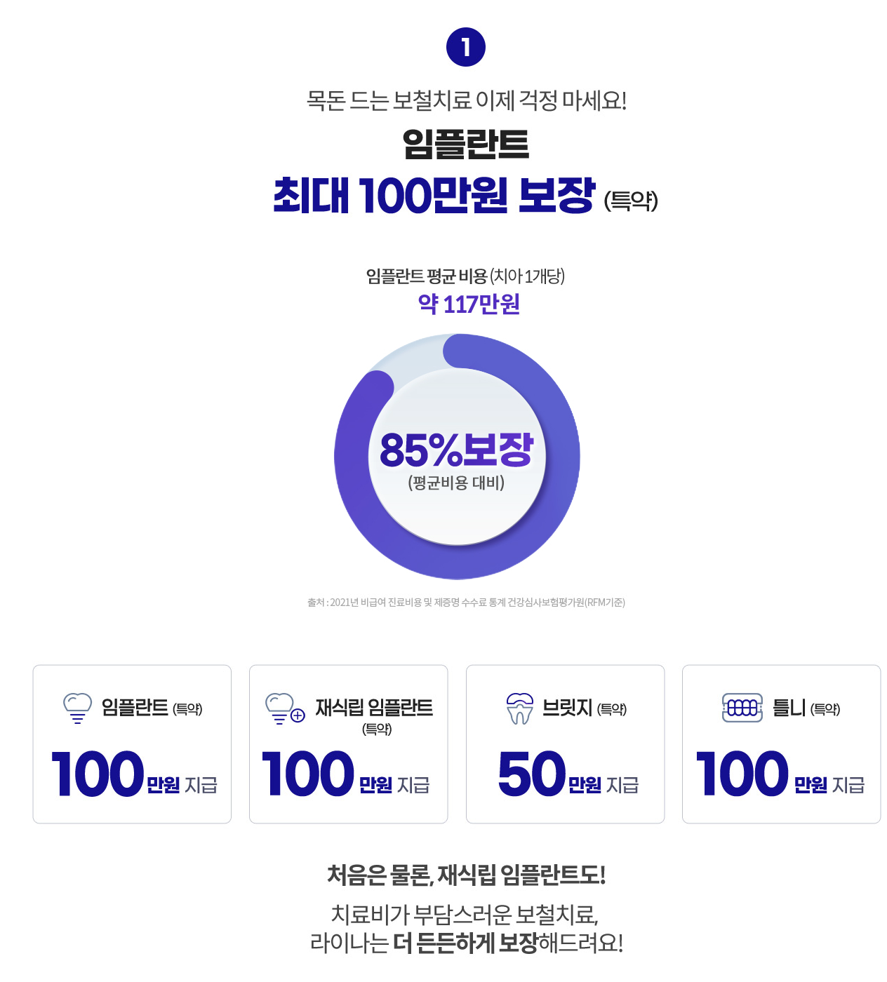 - 치아 치료비, 임플란트, 보철물, 교정치료 등 다양한 치과 진료에 대해 보장해줍니다.