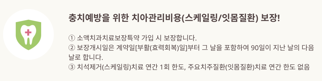 - 치아 관련 예방진료비: 최대 50% 보장 (연간 최대 20만원)