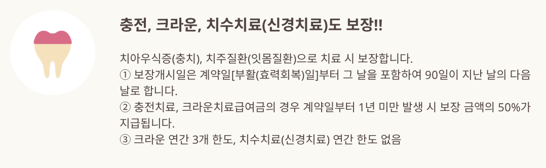 - 치아 관련 사고로 인한 입원비, 수술비, 통원비 등도 보장해줍니다.