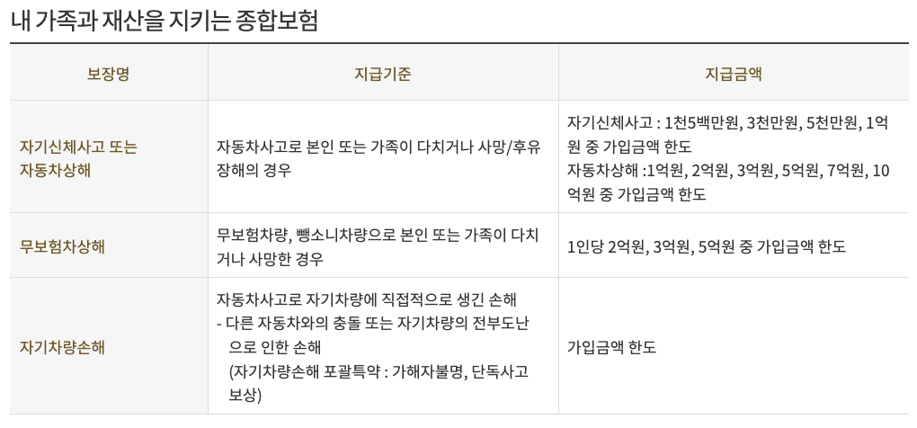 - 내가 받은 피해를 보상하는 담보: 자기신체사고, 운전자보호, 차량손해, 도난손해, 화재손해 등