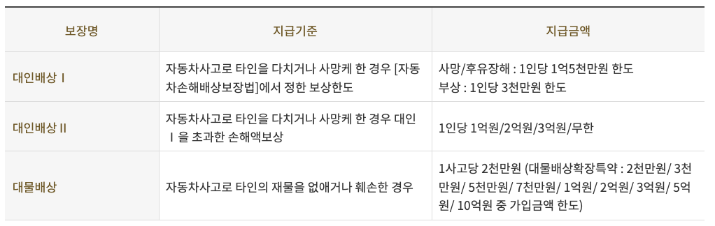 - 타인의 피해를 보상하는 담보: 자기차량손해, 대인배상, 대물배상, 무보험차량상해 등
