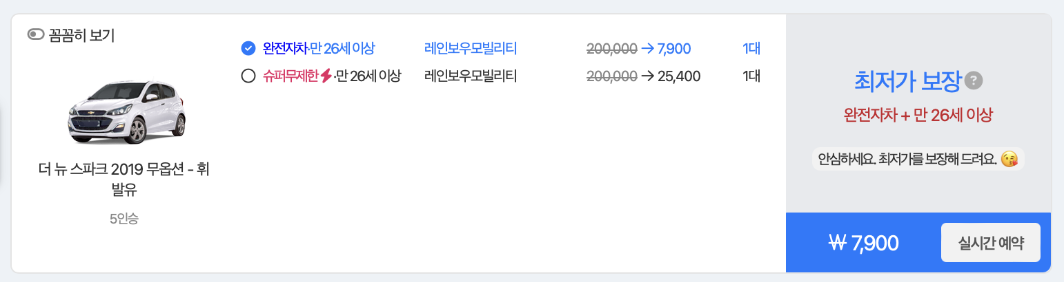 - 스파크 (소형차) : 일반자차 6만원, 완전자차 7만원, 부분무제한 8만원, 슈퍼무제한 9만원