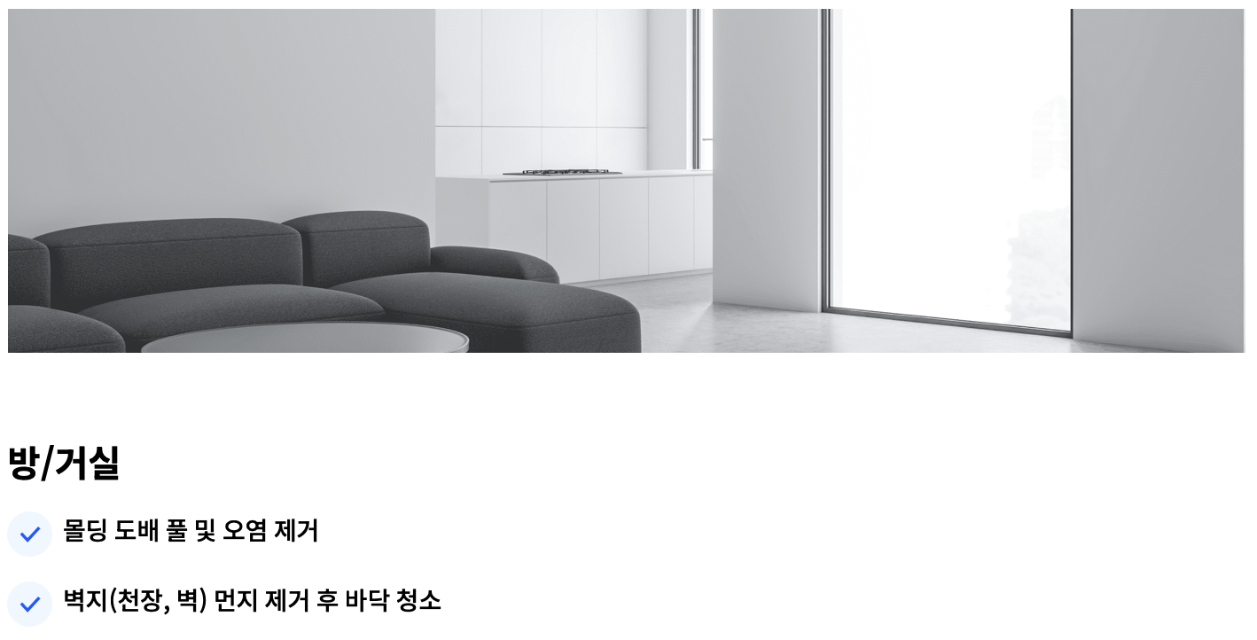 - 서비스: 입주청소 업체마다 제공하는 서비스의 종류와 범위가 다릅니다. 일반적으로 천장, 벽면, 바닥, 문짝, 수전, 화장실, 부엌 등의 기본 청소는 포함되지만, 추가로 가구 세척, 가전제품 세척, 줄눈 제거, 새집증후군 방지 등의 작업을 원하시면 추가 비용이 발생할 수 있습니다.