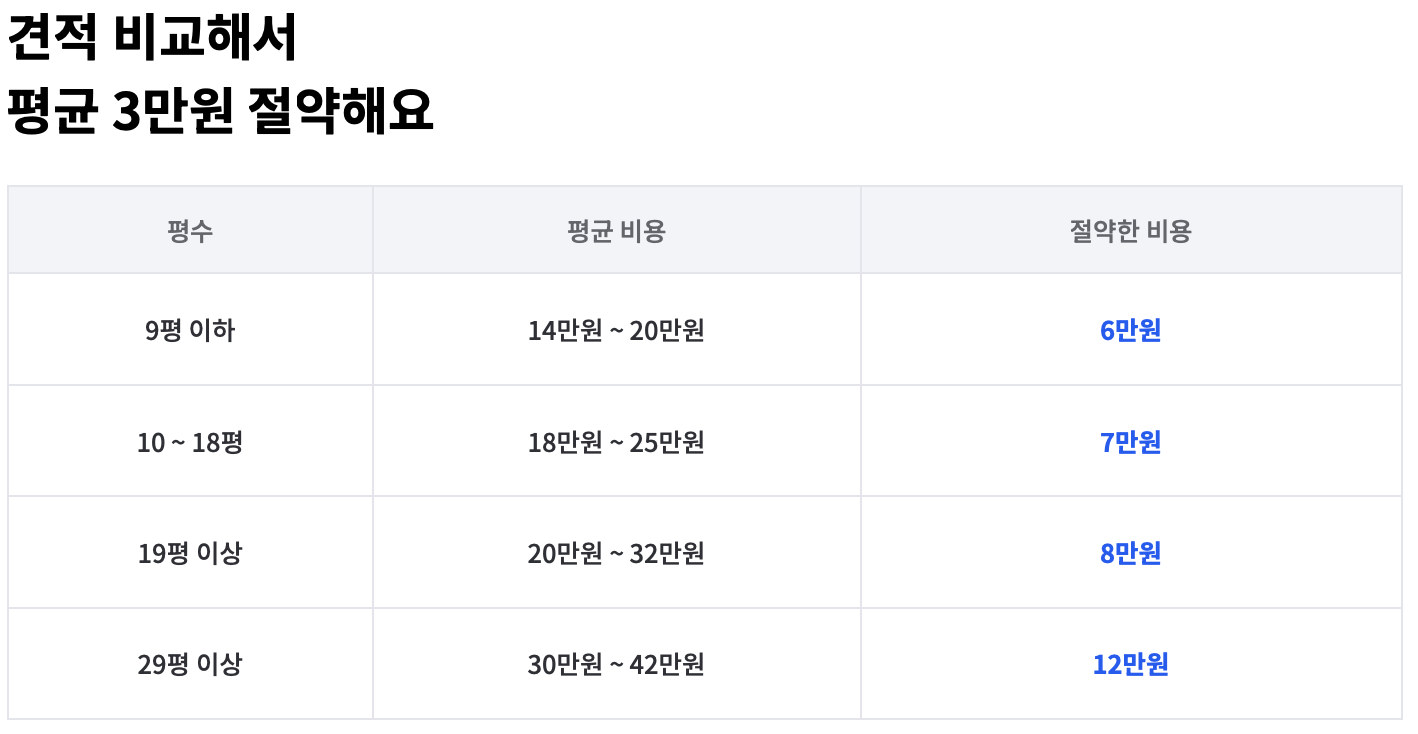 - 견적 비교: 한 번에 여러 업체의 견적을 비교할 수 있는 플랫폼을 이용하시면 편리합니다. 예를 들어 [미소](https://get.miso.kr/)에서는 간단한 정보 입력 후 최대 4개의 무료 견적을 받아볼 수 있습니다. 견적 내용과 업체 프로필, 평점과 후기 등을 꼼꼼히 비교해 보시고 합리적인 비용의 업체를 선택하시면 됩니다.