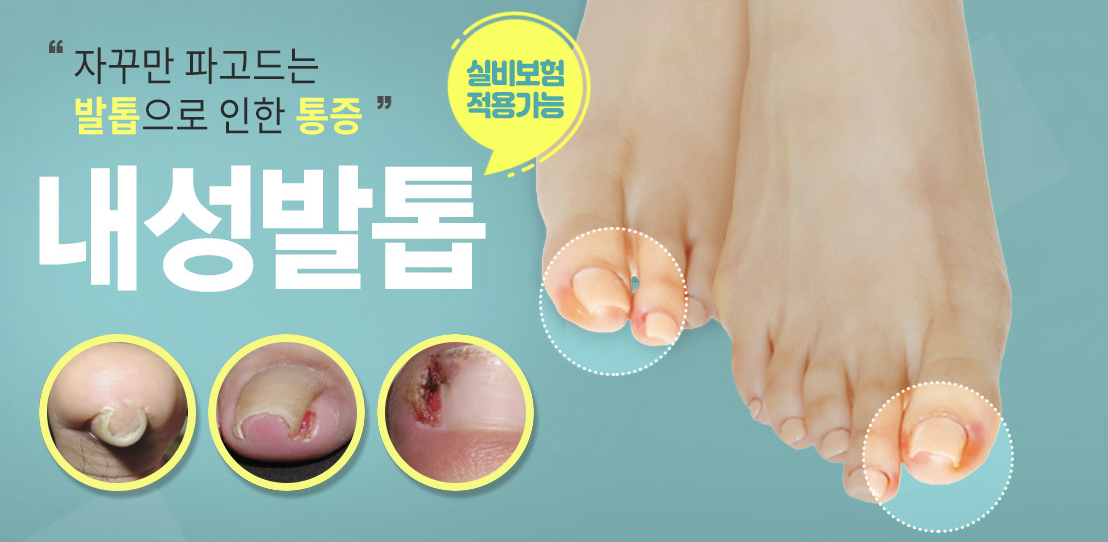 내성발톱이란 발톱이 살 속으로 파고 들어가면서 염증과 통증을 일으키는 질환입니다. 주로 엄지발톱에서 발생하며, 발톱을 너무 짧게 깎거나, 너무 꽉 조이는 신발을 자주 착용하는 분들에게 흔하게 발생합니다. 내성발톱은 직접 겪어 보지 않으면 모를 정도의 심한 통증을 유발한다고 합니다. 발병 초기에 치료를 시작할수록 더 예후가 좋기 때문에 빠르게 치료를 시작하는 것이 매우 중요한 질환입니다.