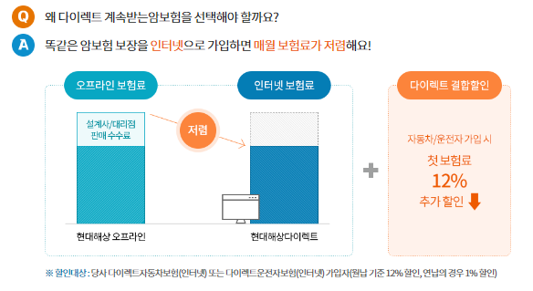 현대해상 다이렉트를 통해 가입하시면, 오프라인 대비 저렴한 보험료로 동일한 보장을 받으실 수 있습니다. 또한, 다이렉트 자동차보험이나 운전자보험과 결합할인 혜택도 받으실 수 있습니다.