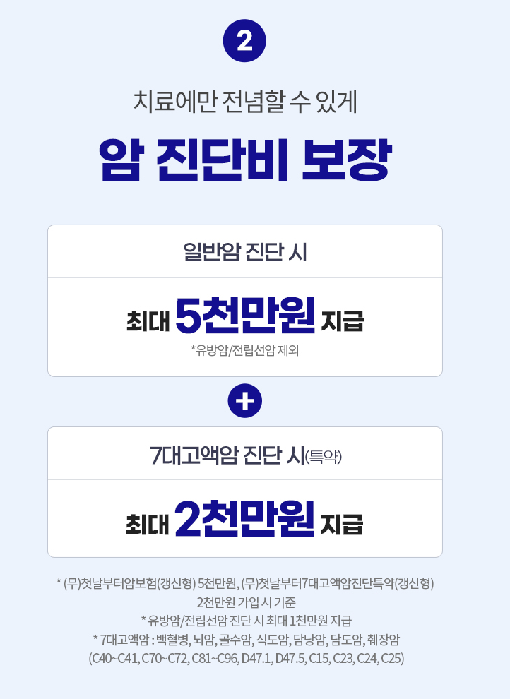 진단비는 진단 확정 후 한꺼번에 지급되며, 치료비 이외에 생활비나 간병비 등 필요한 곳에 사용할 수 있습니다. 암 유형별로 나누어 진단비를 보장하며, 뇌와 심장질환의 경우 최초 1회 보장합니다.