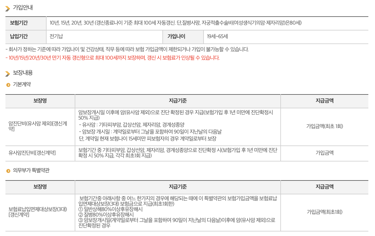 자세한 상품 내용과 가입 조건은 한화생명 홈페이지에서 확인하실 수 있습니다. [한화생명 e시그니처암보험 무배당 (비갱신)] 페이지를 방문하여 상품특징, 보장내용, 기본정보 등을 자세히 살펴보시기 바랍니다.
