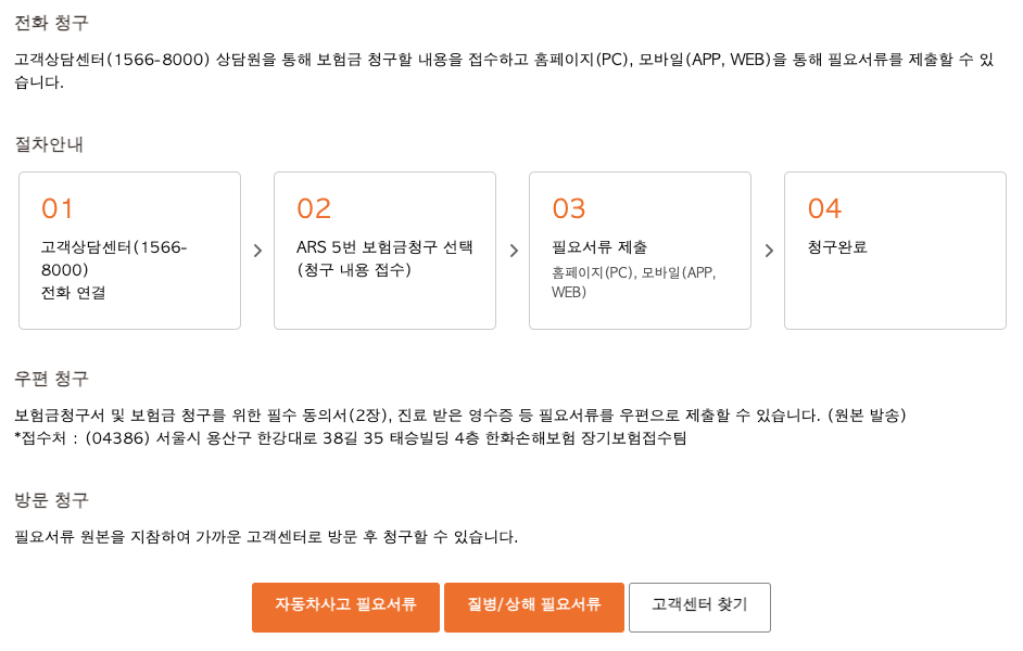 3. 방문 청구: 가까운 한화손해보험 지점을 방문하여 직접 청구할 수 있습니다.