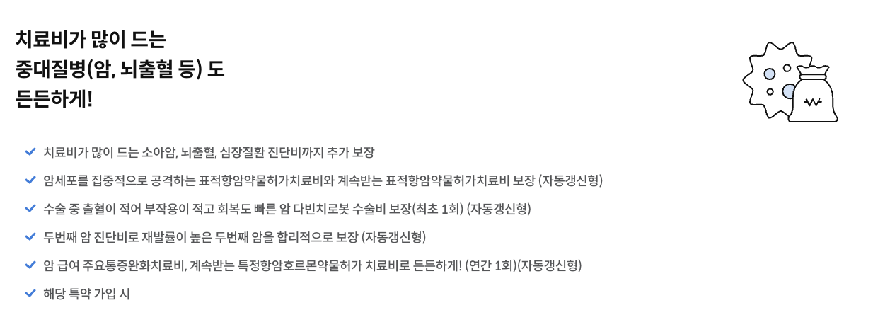 - 중대 질병 보장: 암, 백혈병 등 중대 질병에 대한 보장을 제공합니다.