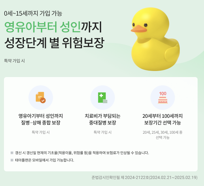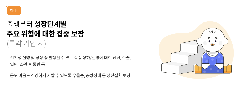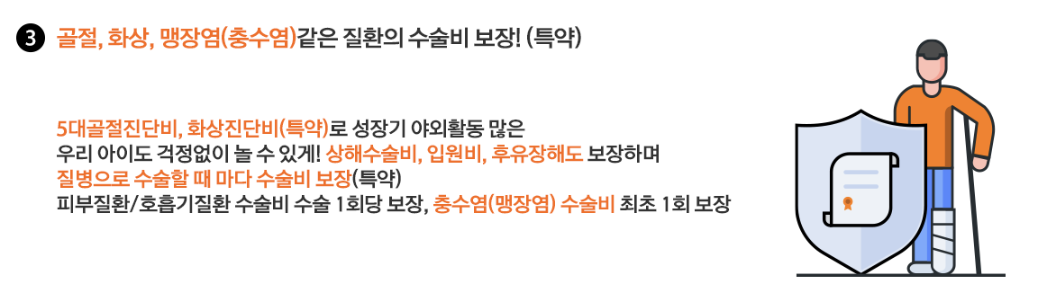 이 보험은 활동량이 많은 어린이들이 예상치 못한 중대 질병에 대비할 수 있도록 119대 질병 수술비 특약을 포함하여 생활 속에서 발생할 수 있는 크고 작은 질병의 수술비도 보장합니다. 또한, 특정 법정 감염병 진단비와 4대 안과 진단비 등 아이들의 건강을 위한 다양한 특약을 제공하여, 부모님들이 아이들의 건강을 더욱 철저히 보호할 수 있도록 돕습니다.