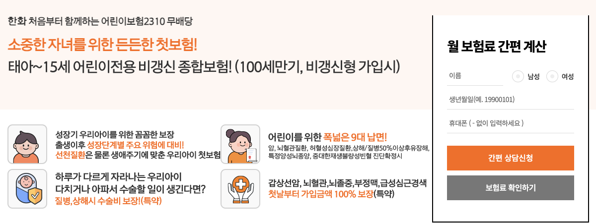 또한, 한화손해보험의 자녀보험은 가입 예시와 보장 내용을 자세히 제공하고 있어, 부모님이 자녀를 위한 보험을 선택할 때 도움이 될 수 있는 정보를 충분히 제공합니다. 보험료는 나이, 성별, 보험 가입 금액에 따라 달라지며, 자세한 보험료 예시는 한화손해보험의 공식 웹사이트에서 확인할 수 있습니다.