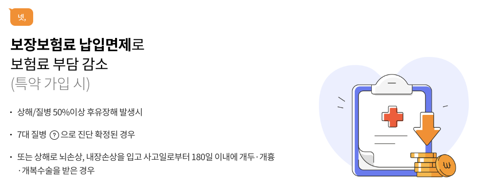 이 보험은 또한 보험료 납입 면제 혜택을 제공하여, 특정 조건 하에 보험료 납입 의무가 면제되는 경우가 있습니다. 예를 들어, 상해나 질병으로 인해 일정 수준 이상의 후유 장해가 발생하거나, 특정 중대 질병에 걸렸을 때 보험료 납입 면제 혜택을 받을 수 있습니다.