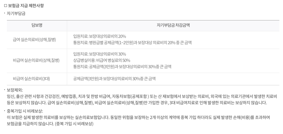 보험 약관에 따라 일부 항목은 보장에서 제외될 수 있으며, 예를 들어 치과치료나 한방치료와 같은 특정 의료비는 보장하지 않는 경우가 있습니다. 또한, 외국 의료기관에서 발생한 의료비나 자동차보험 또는 산재보험에서 보상받은 의료비 등은 보장하지 않습니다.