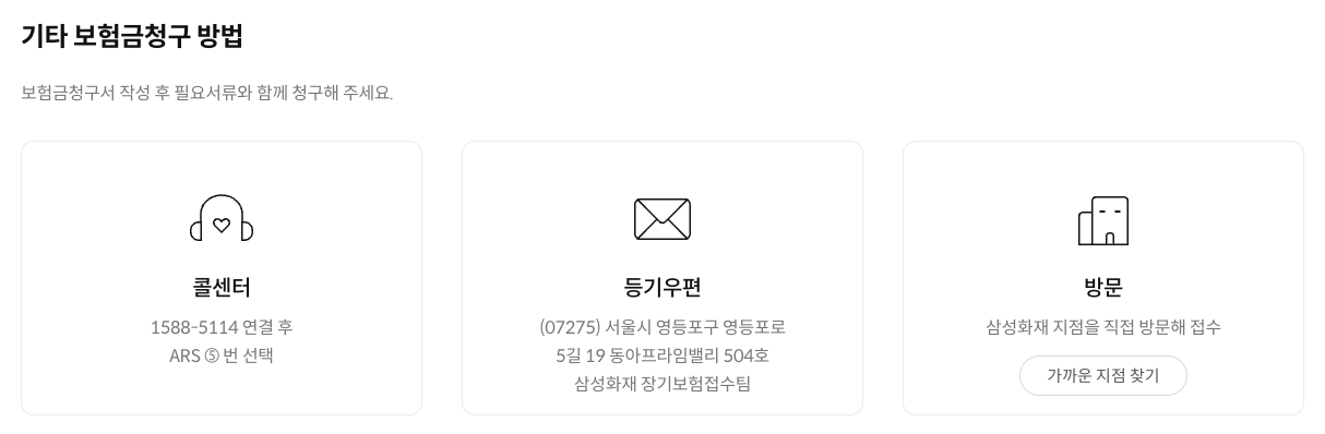 세 번째는 직접 방문하여 청구하는 방법입니다. 가까운 삼성화재 고객지원센터를 방문하여 보험금을 청구할 수 있으며, 고객지원센터 위치는 삼성화재 홈페이지에서 확인할 수 있습니다.