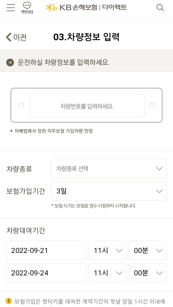 차량 정보와 보험 기간을 설정합니다.