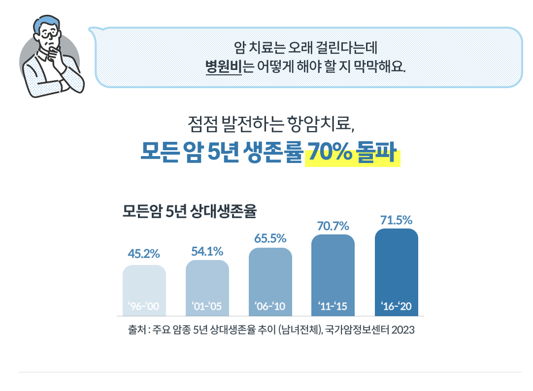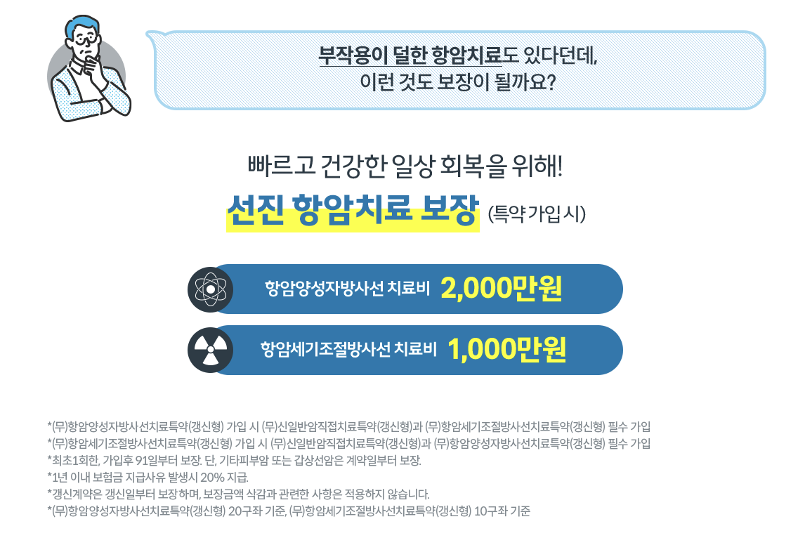 또한, 고객은 입원 첫날부터 입원비를 보장받을 수 있으며, 통원 치료 시에도 횟수에 관계없이 통원비를 받는 특약을 설계할 수 있습니다. 유병자의 경우, 간편심사형을 통해 3가지 질문을 통과하면 상품에 가입할 수 있는 접근성을 제공합니다. 부작용이 적은 양성자 치료와 세기조절 방사선 치료와 같은 선진 항암 방사선 치료들도 특약으로 추가할 수 있어, 치료 후 삶의 질을 개선할 수 있습니다.