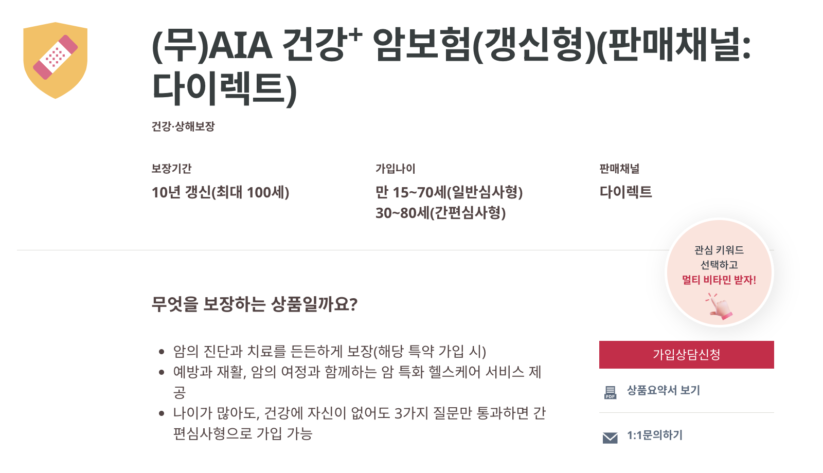 AIA생명 암보험은 한국에서 인기 있는 보험 상품 중 하나로, 암 진단과 치료에 따른 경제적 부담을 줄여주는 데 중점을 두고 있습니다. 이 보험은 암 치료비와 생활자금 지원을 목적으로 하며, 특약에 따라 만기 시 납입 보험료의 100%를 환급받을 수 있는 옵션도 제공합니다. AIA생명의 웹사이트에서는 사용자가 직접 보험료를 조회하고, 간편하게 보험 상품에 가입할 수 있는 온라인 서비스를 제공하고 있습니다.