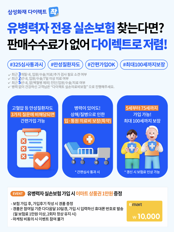 삼성화재 다이렉트 유병자 실손보험은 개인의 의료비 부담을 줄여주는 보험 상품입니다. 이 보험은 고객이 직접 부담해야 하는 의료 급여 본인부담금과 비급여 의료비를 보장하며, 크고 작은 사고나 질병으로 인한 급여 실손의료비와 비급여 실손의료비 특약을 제공합니다. 태아부터 65세까지 가입이 가능하며, 최대 100세까지 보장을 받을 수 있습니다. 또한, 이 상품은 5년 단위로 재가입이 가능하고, 보험기간 중 질병이 생겨도 동일한 조건으로 재가입을 통해 보장을 이어갈 수 있습니다. 갱신 시 보험료 인상 가능성이 있으나, 직전 2년간 비급여 보험금 지급이 없었다면 갱신 시 영업보험료의 10% 할인 혜택을 받을 수 있습니다. 이 보험은 삼성화재 다이렉트 공식사이트를 통해 가입할 수 있으며, 인터넷 가입으로 자사 오프라인 대비 저렴한 보험료로 이용 가능합니다.