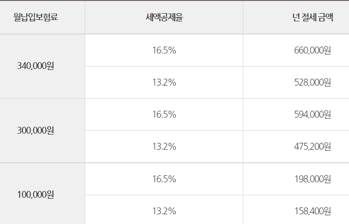 연간 납입보험료 300만원 한도 세액공제는 아래와 같습니다.