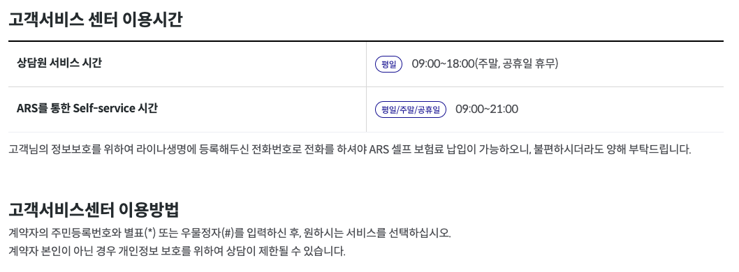고객센터의 운영 시간은 평일 오전 9시부터 오후 6시까지이며, 주말과 공휴일은 휴무입니다. ARS를 통한 셀프 서비스는 평일, 주말, 공휴일 모두 오전 9시부터 오후 9시까지 이용 가능합니다. 라이나 생명은 고객의 편의를 위해 다양한 연락 방법을 제공하며, 고객의 요구에 신속하게 대응하기 위해 노력하고 있습니다. 고객센터를 이용하시려면 라이나 생명에 등록된 전화번호로 연락을 하셔야 하며, 계약자 본인이 아닌 경우 개인정보 보호를 위해 상담이 제한될 수 있음을 유의하시기 바랍니다. 장애인 고객을 위한 전용 서비스도 마련되어 있어, 전화 상담이 어려운 경우 다른 방법을 통해 지원을 받을 수 있습니다. 라이나 생명은 고객의 다양한 상황에 맞춰 최선을 다하는 서비스를 제공하고자 합니다.