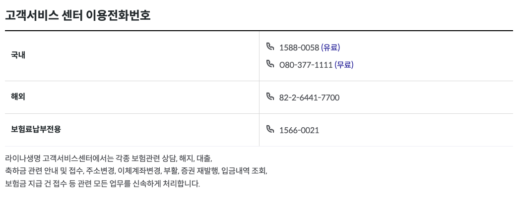 라이나 생명 고객센터는 고객의 다양한 요구에 대응하기 위해 여러 연락처를 제공합니다. 국내 고객의 경우, 일반 상담을 위한 번호로 1588-0058을 사용할 수 있으며, 이는 유료 서비스입니다. 무료 서비스를 원하는 고객은 080-377-1111로 연락할 수 있습니다. 해외에 계신 고객은 82-2-6441-7700을 이용하여 라이나 생명과 연락할 수 있습니다. 보험료 납부와 관련된 전용 번호로는 1566-0021이 있습니다.