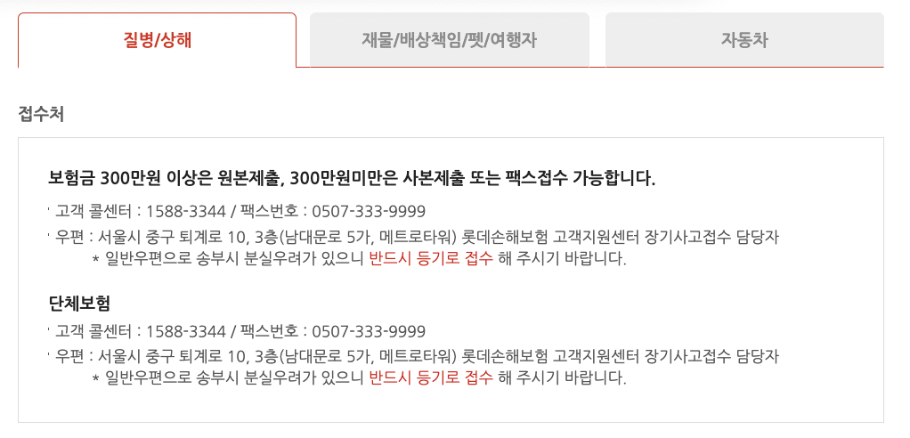 보험금 청구서류는 롯데손해보험의 고객지원센터로 제출할 수 있으며, 보험금의 액수에 따라 원본 또는 사본 제출이 가능합니다. 또한, 팩스나 우편으로도 접수가 가능하며, 우편으로 제출할 경우 분실의 우려가 있으니 등기로 접수하는 것이 좋습니다.