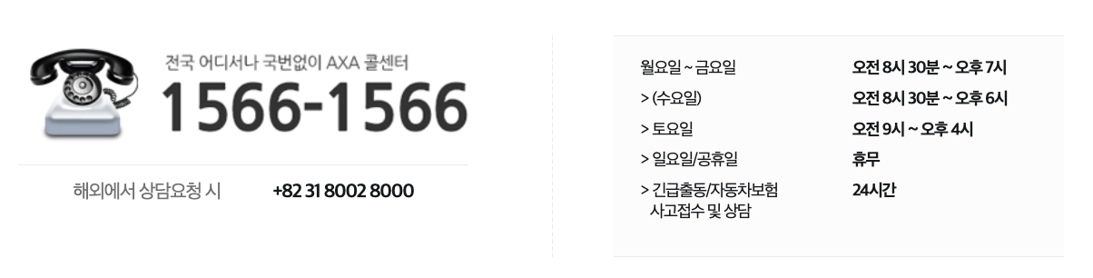 AXA 손해보험의 고객센터는 평일 오전 8시 30분부터 오후 7시까지(수요일은 오후 6시까지), 토요일은 오전 9시부터 오후 4시까지 운영되며, 일요일과 공휴일은 휴무입니다. 해외에서 상담을 원할 경우에는 +82 31 8002 8000으로 연락할 수 있습니다.