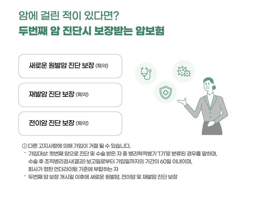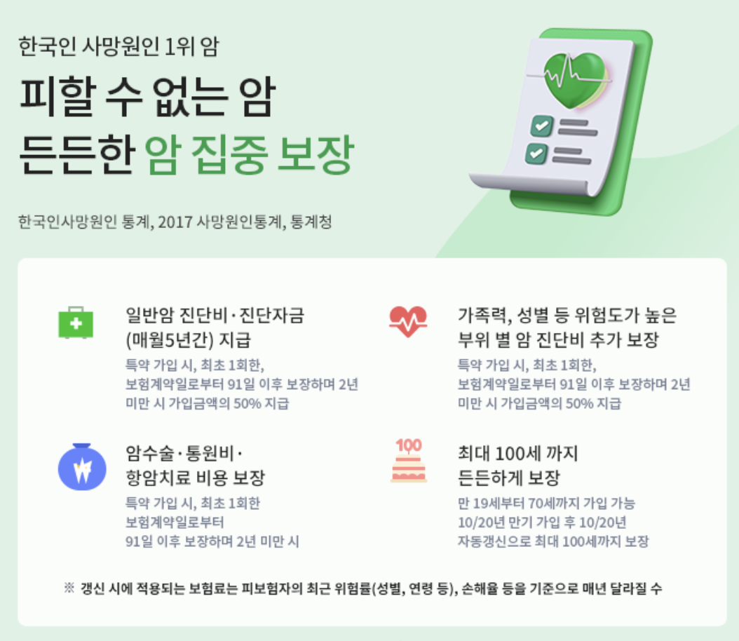 이 상품은 갱신형 암 보험으로, 20년 만기(최대 100세까지)와 20년 납(최대 60년까지)의 조건으로 가입할 수 있으며, 건강 검진 결과만으로도 간편하게 가입이 가능합니다. 가입 대상은 0세부터 70세까지로, 나이와 성별, 건강 상태에 따라 보험료가 책정됩니다.
