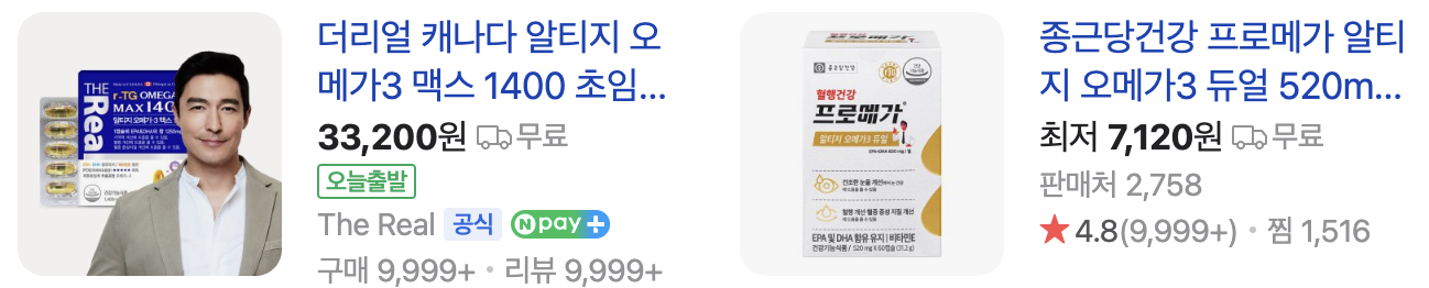 - 마지막으로, '프리미엄 오메가3'는 가장 높은 순도와 함량을 자랑하는 제품입니다. 이 오메가3 영양제는 엄선된 원료와 철저한 품질 관리를 통해 생산되며, 관절 건강과 피부 건강 유지에 탁월한 효과를 보입니다. 또한, 레몬향이 첨가되어 있어 섭취 시 비린내를 줄여줍니다.