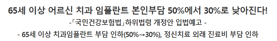 65세 이상의 어르신들이라면 치과에서 치료하는 임플란트에 건강 보험을 적용하면 본인 부담금 30%만 내면 임플란트가 가능합니다.