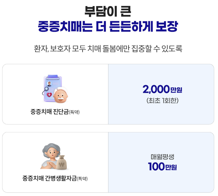 - 진단비: 치매 진단 확정 시 일시금으로 지급되는 보험금