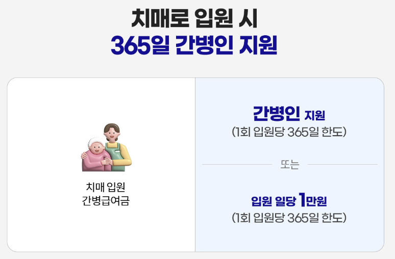 - 간병비: 요양 시설 입소 또는 재가 간병 서비스 이용 시 지급되는 보험금