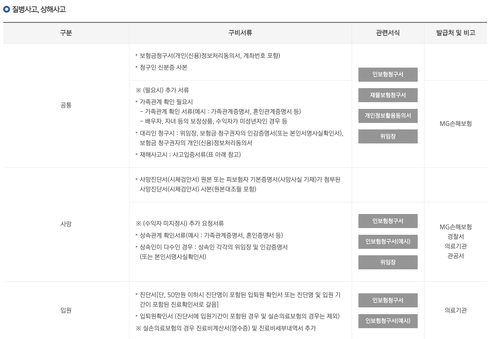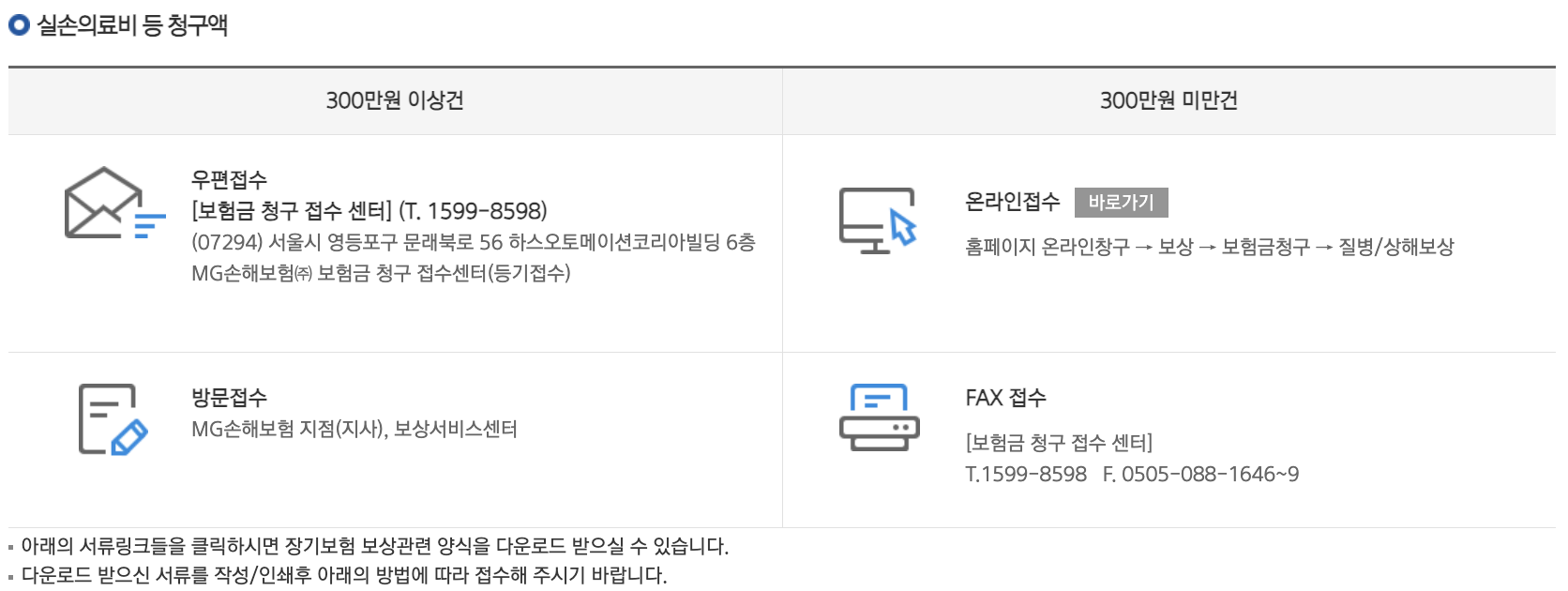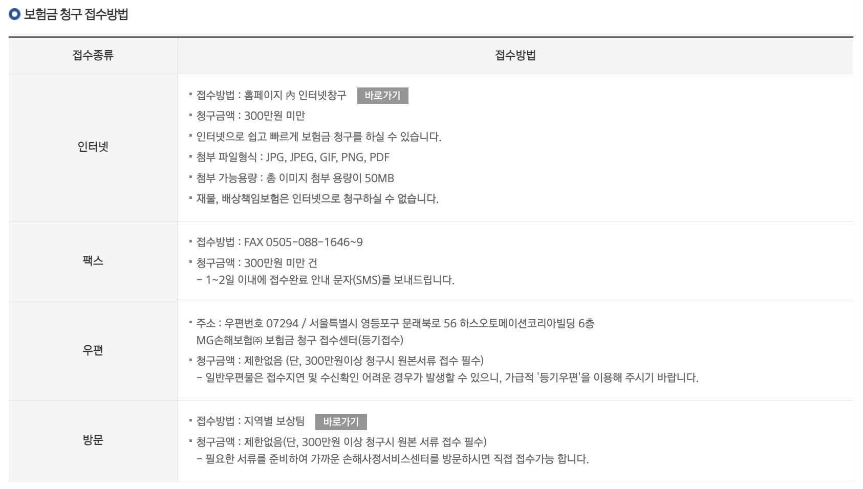 - 우편 청구: 필요 서류를 준비하여 우편(경기도 성남시 분당구 구미동 159-1 MG손해보험빌딩 보상팀)으로 발송합니다.