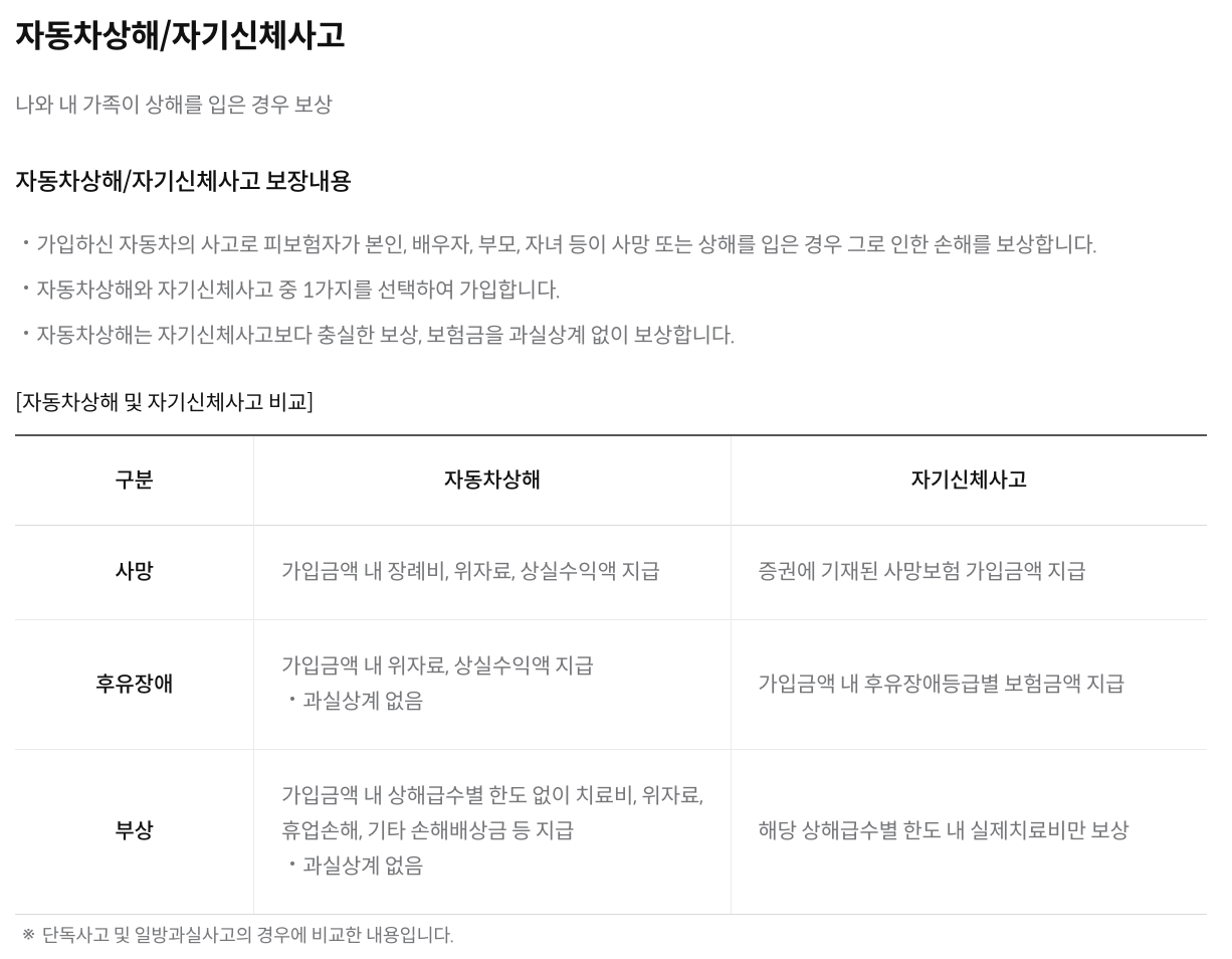 - 자기신체사고: 교통사고로 인해 본인이 상해를 입거나 사망한 경우 보험금을 지급합니다.