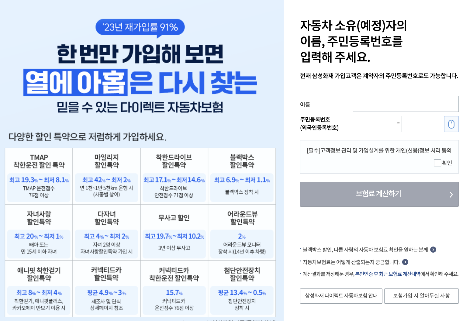 - 편리한 온라인 가입: 삼성화재 다이렉트 홈페이지나 모바일 앱을 통해 간편하게 보험료를 계산하고 가입할 수 있습니다.
