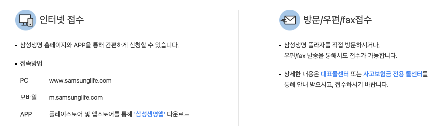 - 홈페이지 청구: 삼성생명 홈페이지에서 서류를 업로드하여 청구할 수 있습니다.