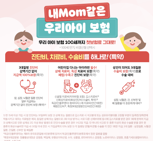 - 메리츠화재 (무)내Mom같은어린이보험: 30세 만기, 100세 만기 선택 가능, 3대 진단비 및 수술비 보장 강화, 희귀난치성 질환 보장