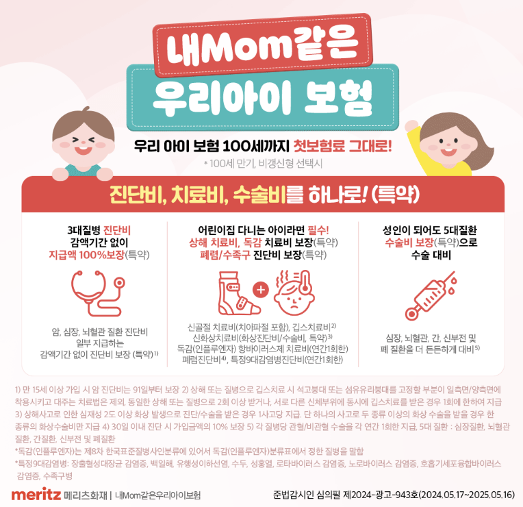 메리츠화재 | 내Mom같은 어린이보험 | 3대 진단비와 수술비 보장 강화, 선천이상 보장 특약 | 3대 질병 보장 강화, 선천이상 보장 특약 선택 가능 | 갱신형 상품 |