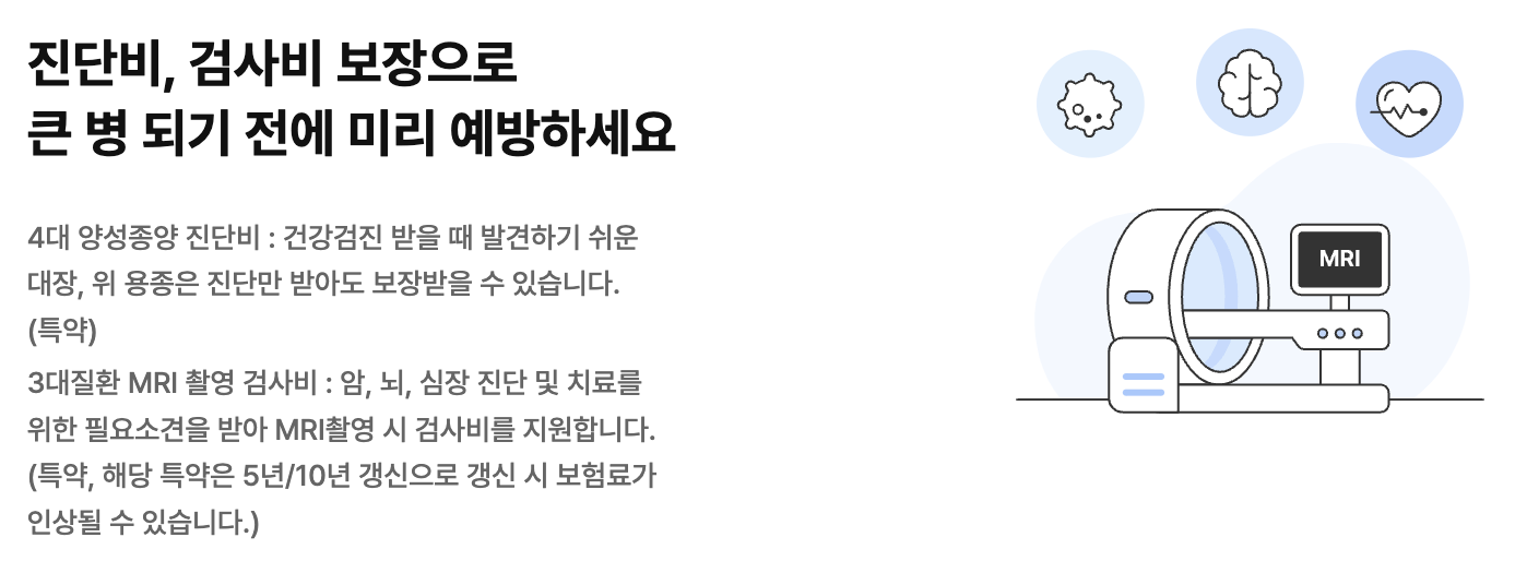 - 진단비: 암, 백혈병, 심장 질환 등 각종 질병 진단 시 보험금 지급
